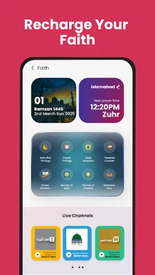 • Faith Section: Stay on top of your religious checklist with features like qibla direction, tasbeeh counter, prayer timings, Quran recitation and other Islamic insights