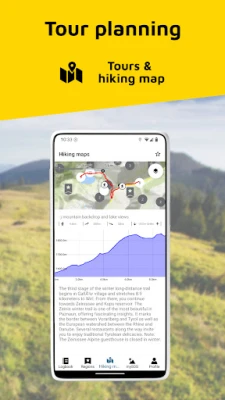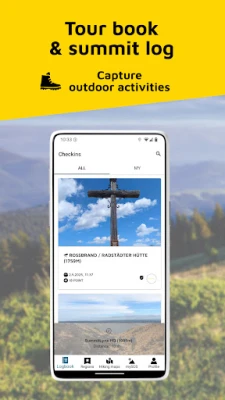 Record your hikes and outdoor activities as if in a personal mountain diary, hiking log, or tour book. When you reach your hiking destination, open the app and create an entry including text, photo, date, and time. The entry function also works offline using GPS.